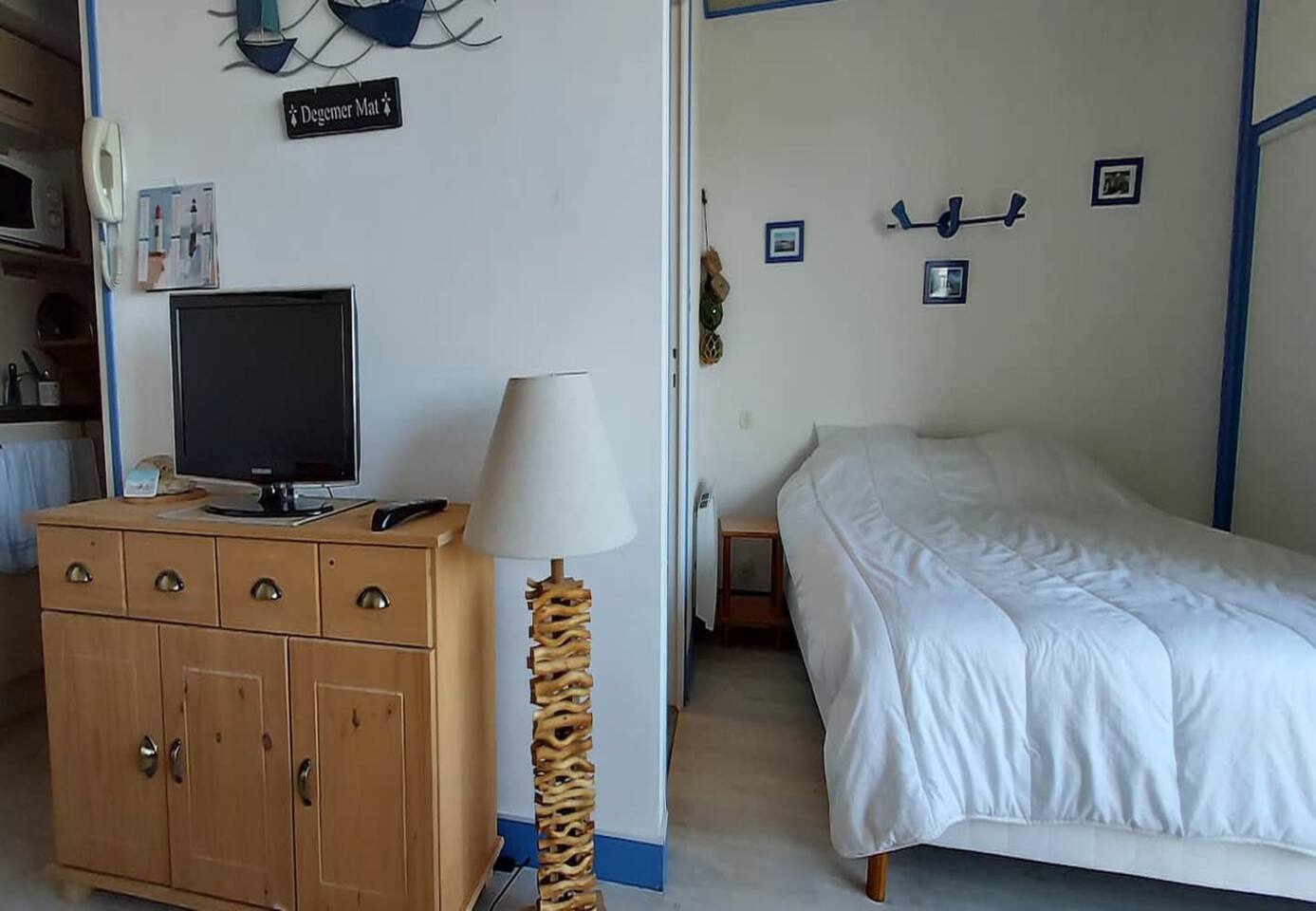 Pièce de vie lumineuse, cuisine équipée, espace repas, coin nuit avec avec un lit double en 160, placards, salle d’eau avec douche, lavabo, lave-linge, coin salon avec banquette et TV.