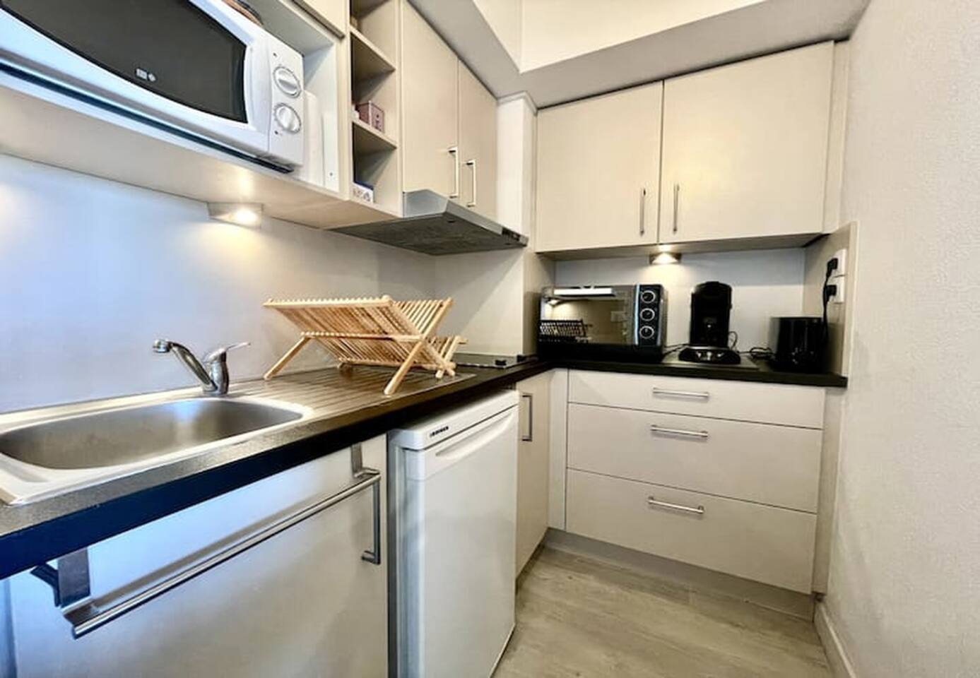 cuisine équipée (grille-pain, cafetière électrique à filtres, bouilloire…) et son espace repas