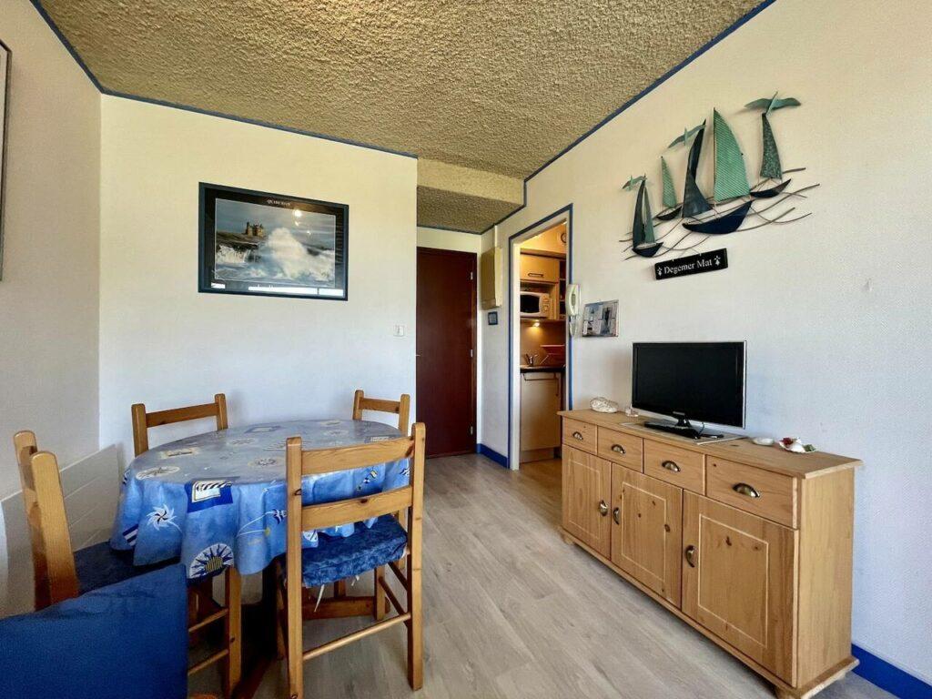 Proche des plages et des commerces de Port Haliguen, profitez d’un studio vue mer avec son balcon aménagé pour vos repas en extérieur face à la mer, parfait pour un séjour détente à deux.