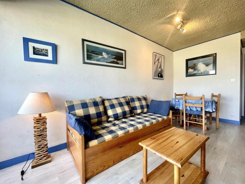 Proche des plages et des commerces de Port Haliguen, profitez d’un studio vue mer avec son balcon aménagé pour vos repas en extérieur face à la mer, parfait pour un séjour détente à deux.